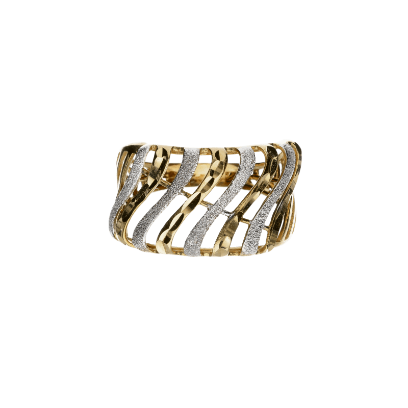 Anello a fascia bicolore da donna realizzato in oro giallo e bianco 18kt 750% con lavorazione satinata.