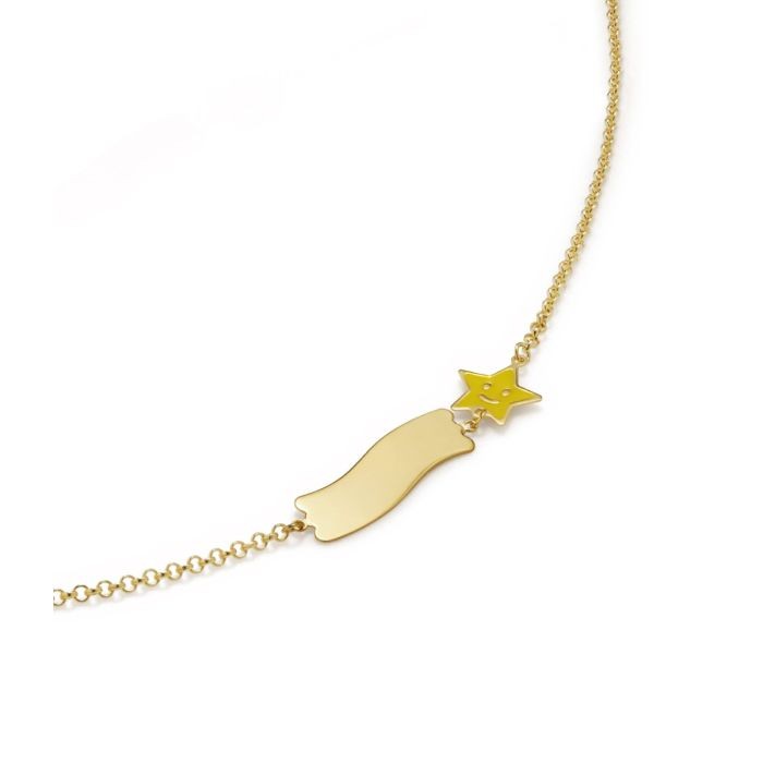 Bracciale da bambina della collezione "Fortuna" Le Bebè realizzato in oro giallo 9kt con stella smaltata e targhetta personalizzabile con incisione. Lunghezza regolabile 13, 15 cm
