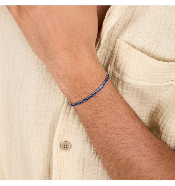 Bracciale tennis da uomo Morellato della collezione Tennis di zirconi blu realizzato in argento 925%. Lunghezza di 18 cm + 3,5 cm; chiusura a moschettone.