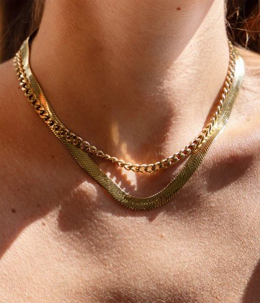 Collana da donna Zag Bijoux della collezione Nokka a più fili in acciaio semplice o placcato oro con maglie diverse. È composta da una catena larga e piatta e da una catena a maglie.