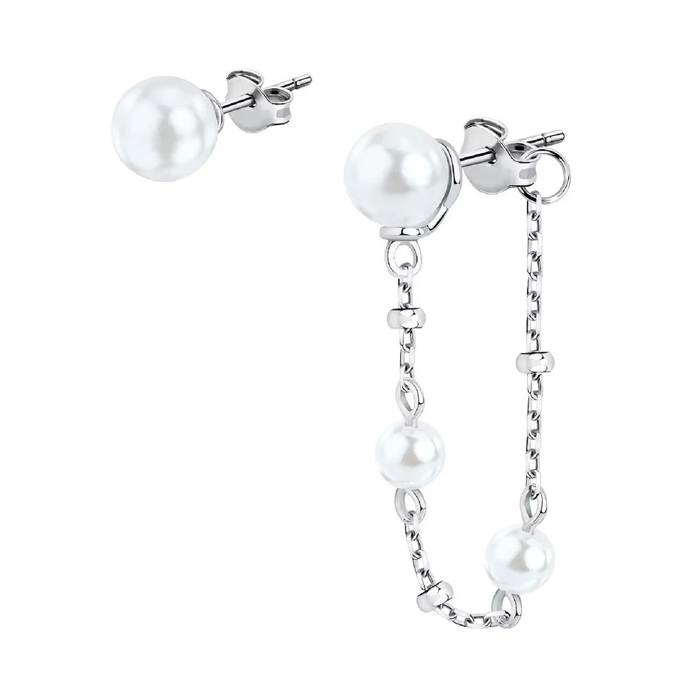 Orecchini della collezione Morellato Perla da donna realizzato in argento 925‰ rodiato uno con una perla e l'altro con una catenella collegata alla chiusura a perno impreziosita da perle.