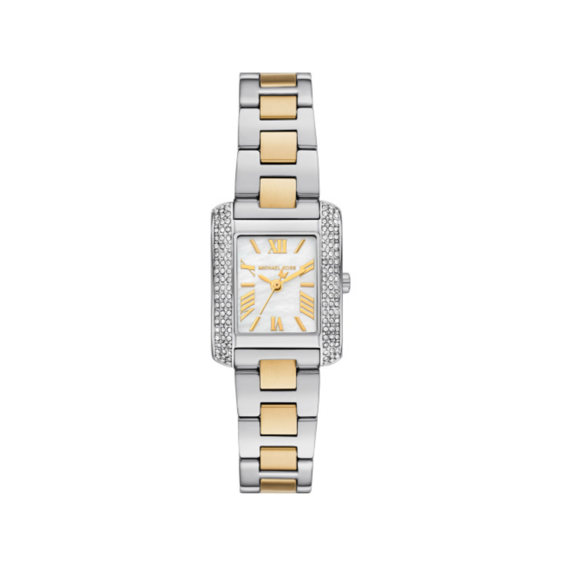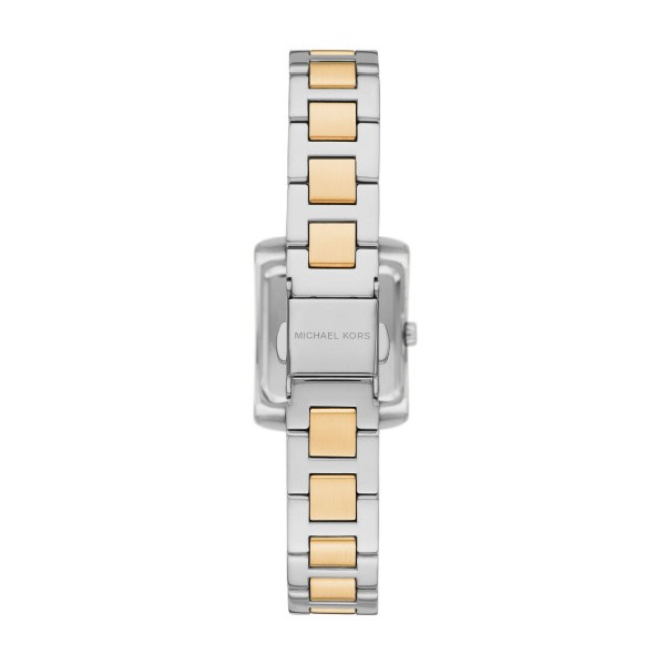 Orologio da donna Michael Kors della collezione Emery realizzato con movimento al quarzo, bicolore con quadrante rettangolare impreziosito da zirconi bianchi.