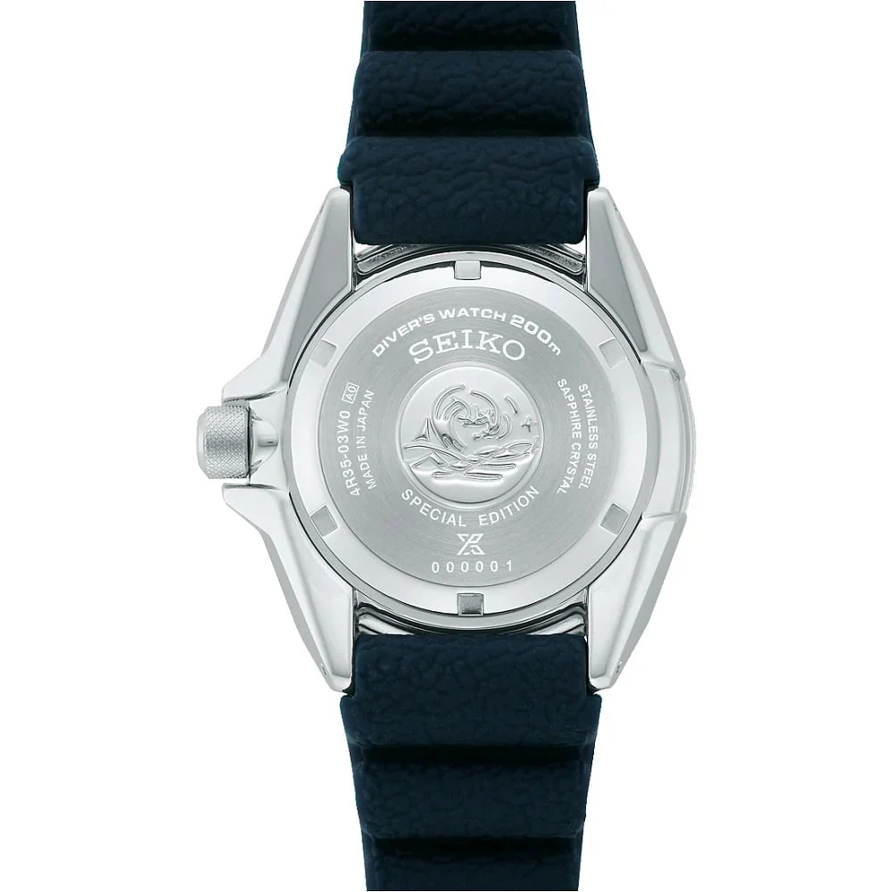 Orologio da uomo Seiko della collezione Prospex "PADI" The Great Blue, il solo tempo ha un meccanismo automatico 4R36 con caratteristica della riserva di carica 41 ore ed a ore 3 è presente la finestrella per la visione della data del mese.