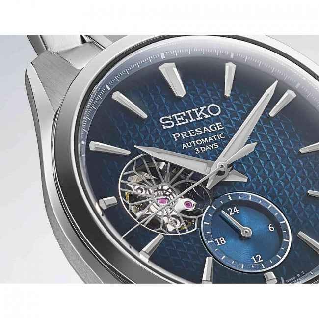 La linea di orologi da uomo Seiko Presage presenta il nuovo Sharpe Edge SPB417J1 con movimento automatico della serie 6R. Questa creazione ha una riserva di carica aumentata di tre giorni a piena carica. Per la prima volta nella serie Sharp Edged, il vetro zaffiro a doppia curvatura conferisce all'orologio un aspetto sottile. Come in tutti gli orologi Sharp Edged, il quadrante presenta un motivo giapponese chiamato asanoha.
