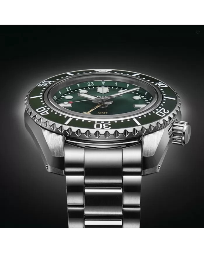Il Seiko Marine Green GMT è alimentato dal nuovo calibro 6R54 interno ed è il primo degli orologi subacquei di Seiko con funzionalità GMT meccanica. Costruito per la vestibilità: il bracciale si adatta comodamente grazie al suo baricentro basso e al passo corto - e durata: con una riserva di carica di tre giorni e scala subacquea in ceramica giapponese resistente ai graffi di alta qualità, la sua resistenza all'acqua è fino a 200 m.