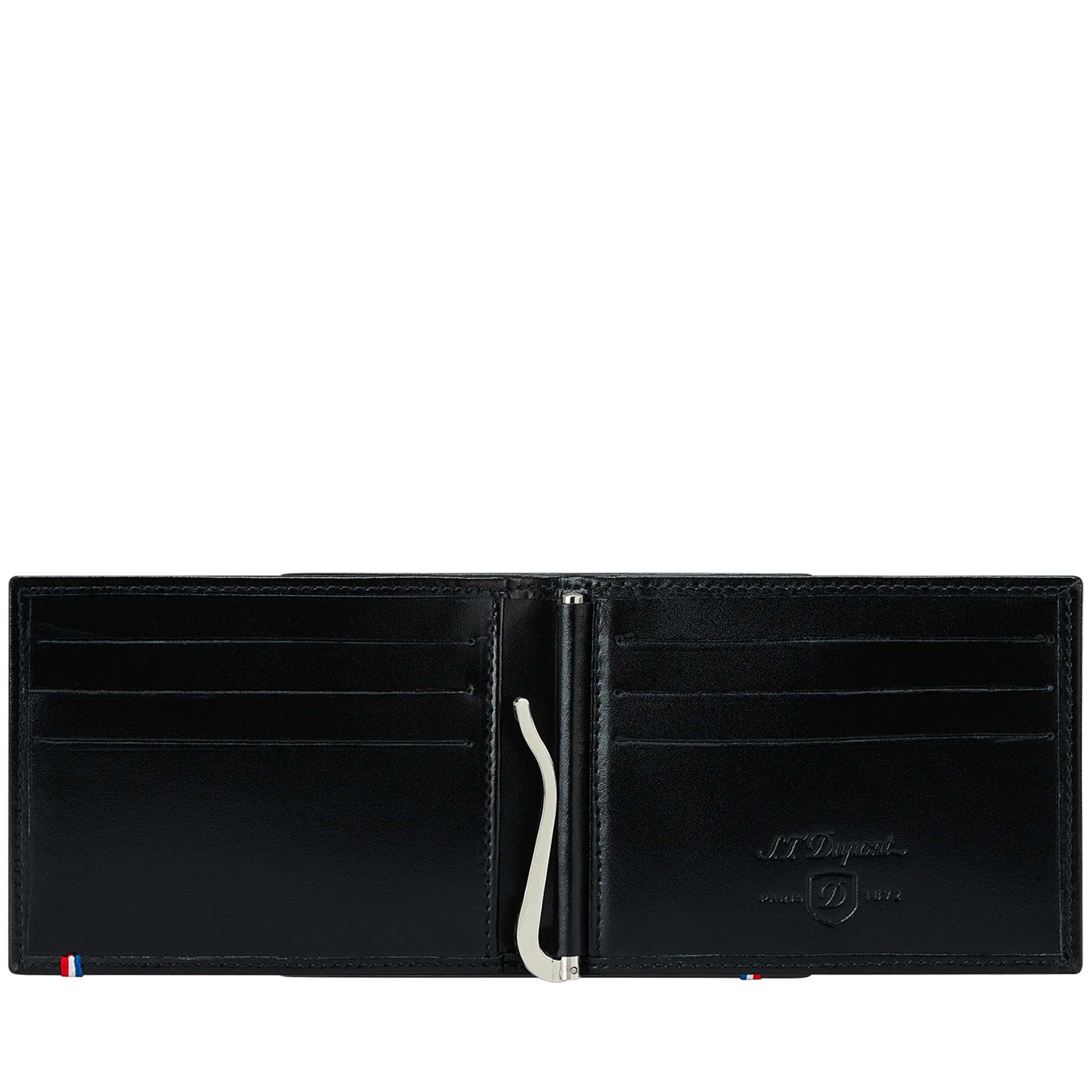 Portafoglio in pelle nera con 6 scomparti +2, e clip in acciaio porta banconote. Elegante e pratico, è il compagno ideale per tutte le borse S.T. Dupont.