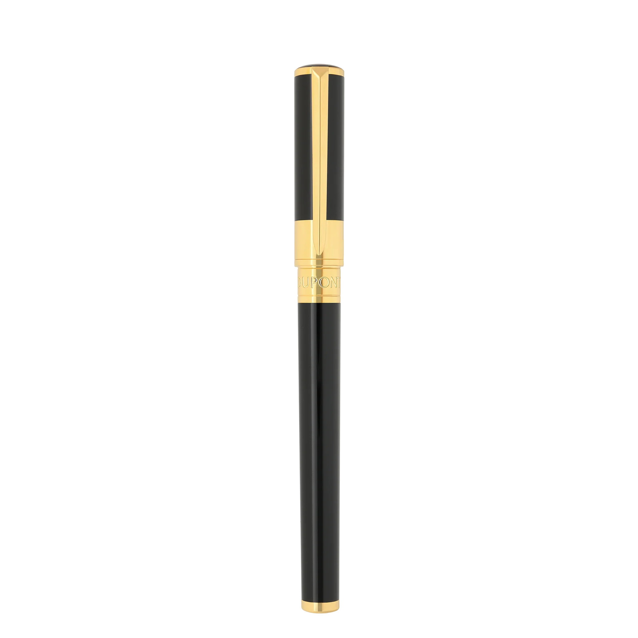Penna stilografica S.T.Dupont realizzata in lacca nera con finiture dorate, con clip articolata “Sword” e top laccato. Pennino “Wings” dorato in acciaio inox. Convertitore incluso.